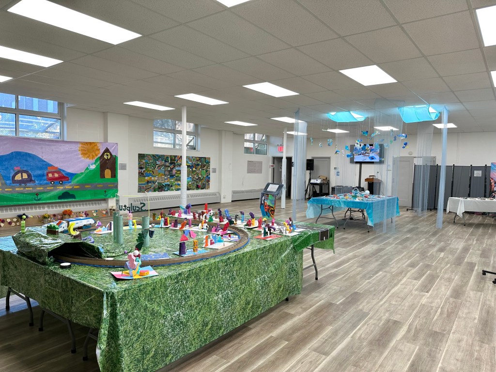 As the weeks went by, all these projects came together beautifully. By the time it was ready to design the exhibition, we had a Road Trip art show filled with 150 students’ stories and creations. The exhibition itself was divided into seven sections: Road Trip Maps, Sculpture Park, Under the Sea, My Travel Hat, My Journey, Mosaic Dreams, and a Community Mural Project. I arranged the sections like a journey, so families and children could “travel” through the exhibition. Everyone had such a great time exploring it together!